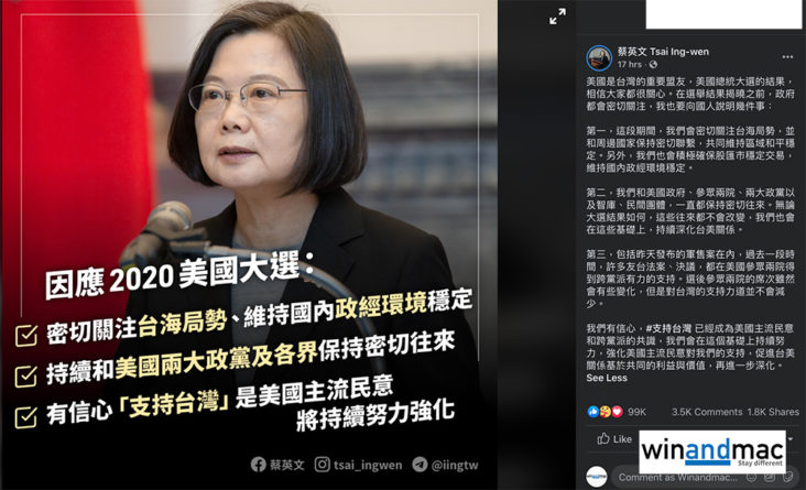 若果不計美國人的話,關心美國總統大選的人,除了香港人外,另一個更關心的或許就是台灣人。因為中共多日在台灣邊境騷擾,令人擔心台海戰爭會因為拜登極有可能上場而觸發。台灣總統蔡英文於社交網絡發表文章談美國總統大選,強調支持台灣是跨黨派共識。