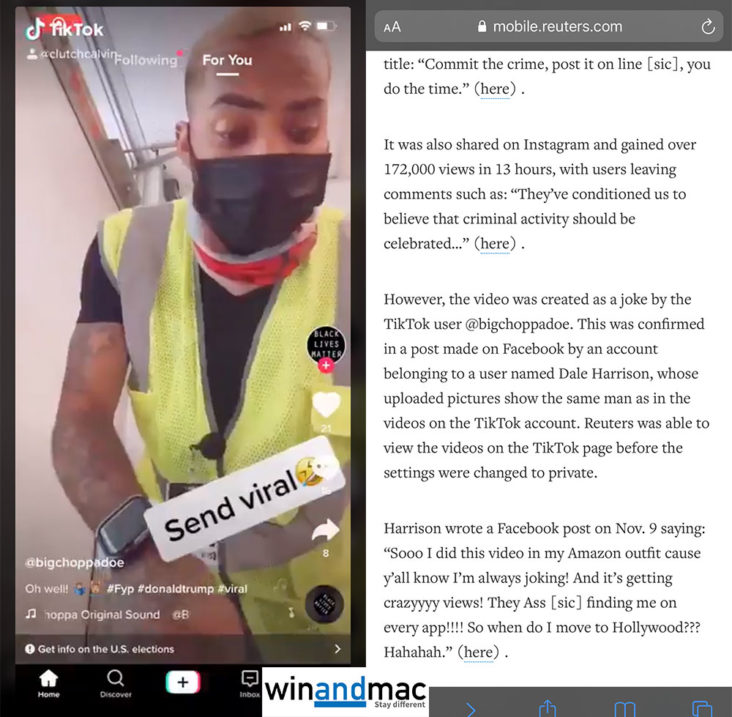 有政界名人表示這是非法行為,理應讓有關人等去坐監。不過路透社宣稱做了Fact Check,指Facebook有一個人叫Dale Harrison,確認是上述左面在抖音發佈影片的人。路透社指,Dale在Facebook中寫道他只是開玩笑,有關工作服裝其實只是Amazon,而不是投票站工人。