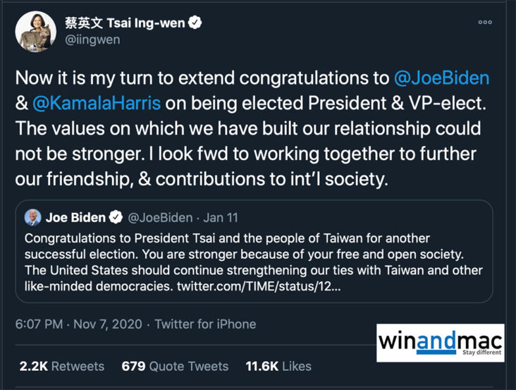 雖然特朗普警告拜登不要搶先宣佈勝利,又指會全力上訴到底,但世界各地的傳媒已陸續認定拜登將會成為下一屆美國總統。世界各國都開始有領導人,開始祝賀拜登當選,希望能緊密合作。其中台灣總統蔡英文也在Twitter上道賀,指台美關係十分好,並期望一起合作,增強雙方盟友關係,以及為國際社會作出貢獻。