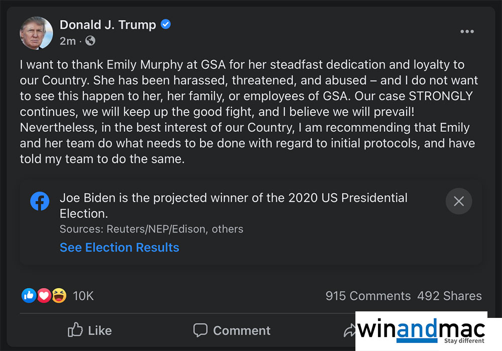 現任總統特朗普Donald Trump在社交網絡上也有談及事件,稱Emily Murphy十分愛國,在這件事上被侮辱、恐嚇、受虐,特朗普不想這些事發生在她本人、家人或總務署員工身上。特朗普強調其案件仍然繼續,將會繼續抗爭,並會反敗為勝。特朗普強調,為了美國,他仍然建議Emily與其工作團隊開展初步政權交接行動,其團隊亦會配合這樣做。