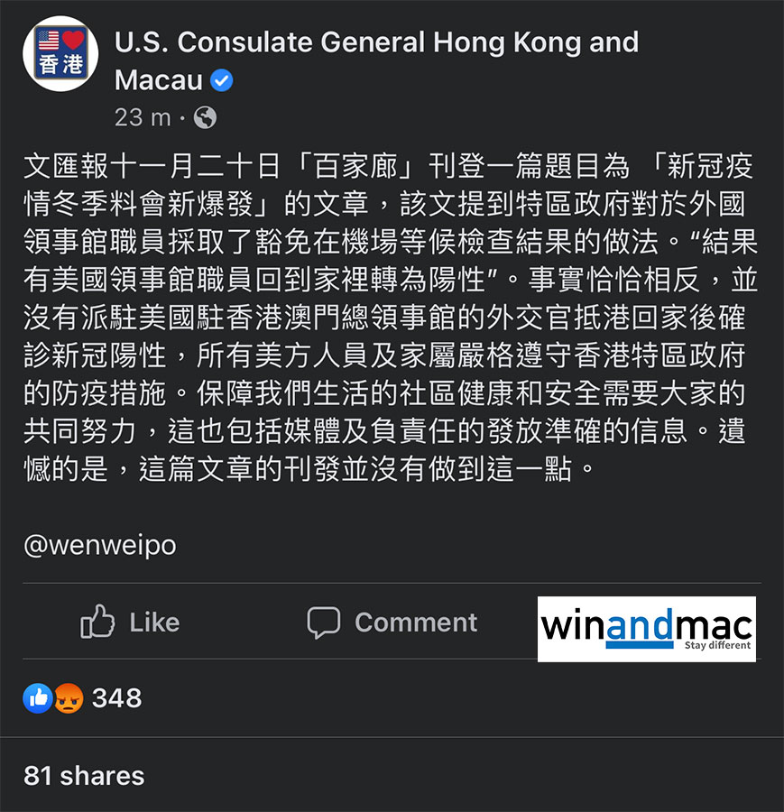 美國駐港領事館忍不住回應,指事情並非如文匯報所述,他們「並沒有派駐美國駐香港澳門總領事館的外交官抵港回家後確診新冠陽性,所有美方人員及家屬嚴格遵守香港特區政府的防疫措施。」,最後更指文匯報沒有負責任的發放準確的信息。