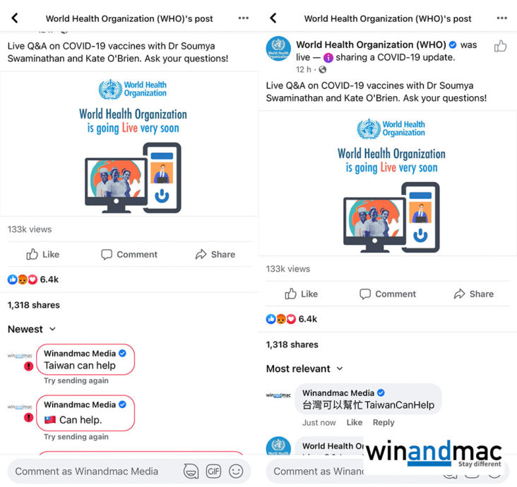 言論審查究竟有幾闊,在那些國家會發生,於現在中共的勢力愈來愈大的情況下,將難以估計。黃之鋒發現,世界衛生組織WHO的Facebook專頁,竟然連Taiwan Can Help一字也容不下。我們記者曾經測試過,無論輸入「Taiwan can help」又或「#TaiwanCanHelp」都被自動刪除,完全無法發表,就連把Taiwan換成表情符號也不行。不過,我們試過中英混雜,則似乎能通過審查。