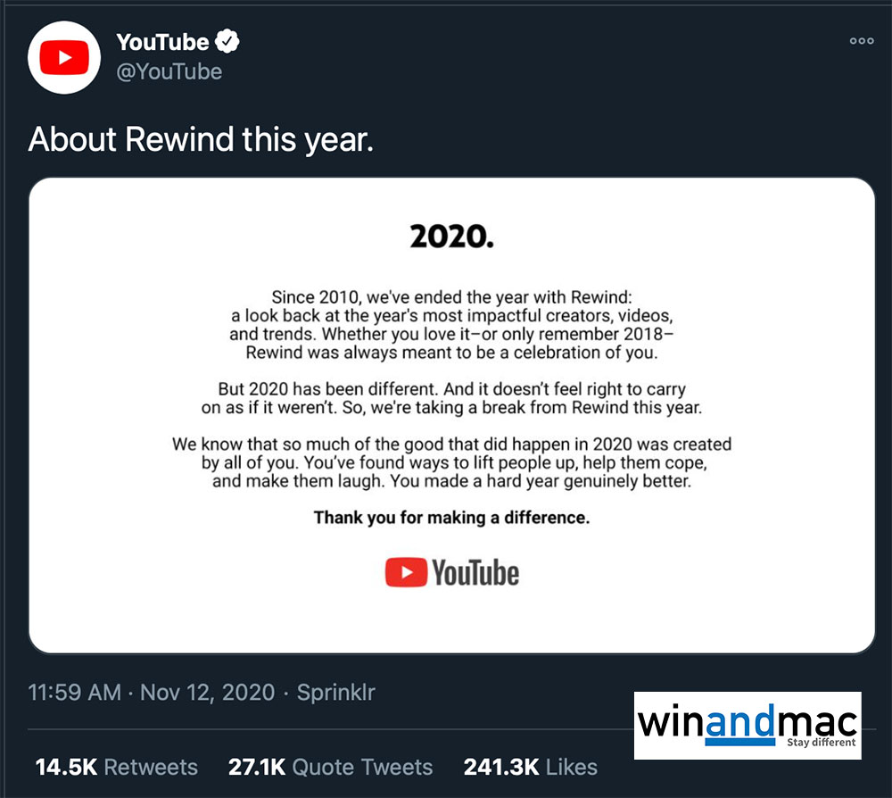 他們官方回應稱,2010年起,每年年底都會跟大家回顧一年的事情,無論大家是否喜歡,抑或只是記得2018年的情況,Rewind都是大家一起慶祝的事情。但2020年則不同,他們覺得感覺不太對,所以今年暫時跳過。