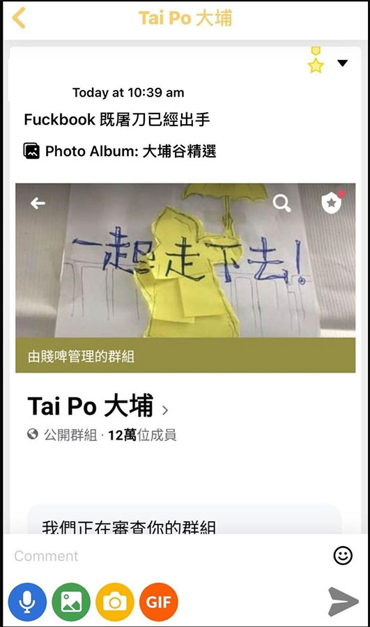 Facebook有不少地區群組,但不是每一個都儲到一定人數。其中最大的群組大埔谷,於今天突然被Facebook封殺,Facebook指因為當中有仇恨言論。管理員已要求重新審查這項決定,但在本文章發佈時大埔谷仍然消失在Facebook中。暫未知那一篇有仇恨言論的文章,引發Facebook作出封鎖。
