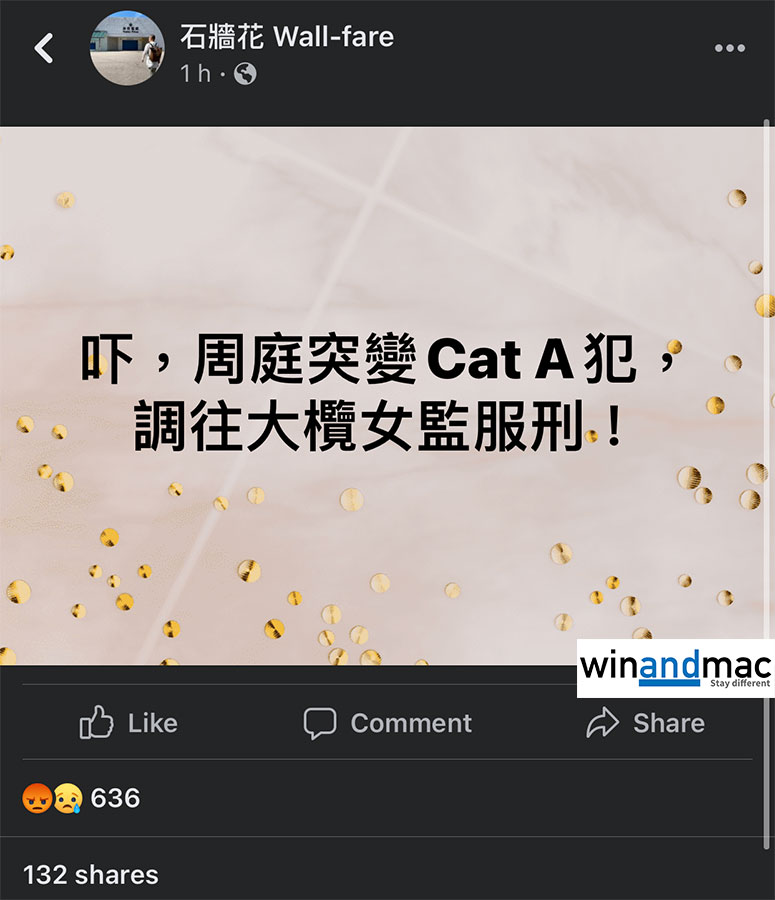 立法會前議員邵家臻成立的石牆花發佈消息,指周庭突然變Cat A犯,亦即所謂甲級重犯,要轉往大欖女懲教所繼續服刑,邵家臻對此感到驚訝。甲級重犯通常都是觸犯謀殺等嚴重罪行,一般刑期較長,周庭早前被判處入獄10個月,今次做法有點令人難以理解。甲級重犯會被單獨囚禁,以及需要重點看管。