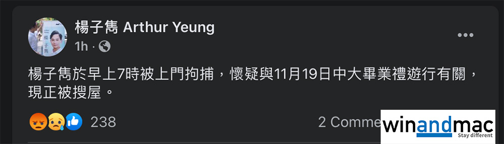 本身是中大校友、曾參選港島樂活區議員但落敗的楊子雋,今日7點突然被警方上門被捕,官方社交網絡發表文章,指懷疑與11月19日中大畢業禮遊行有關,現正被搜屋。