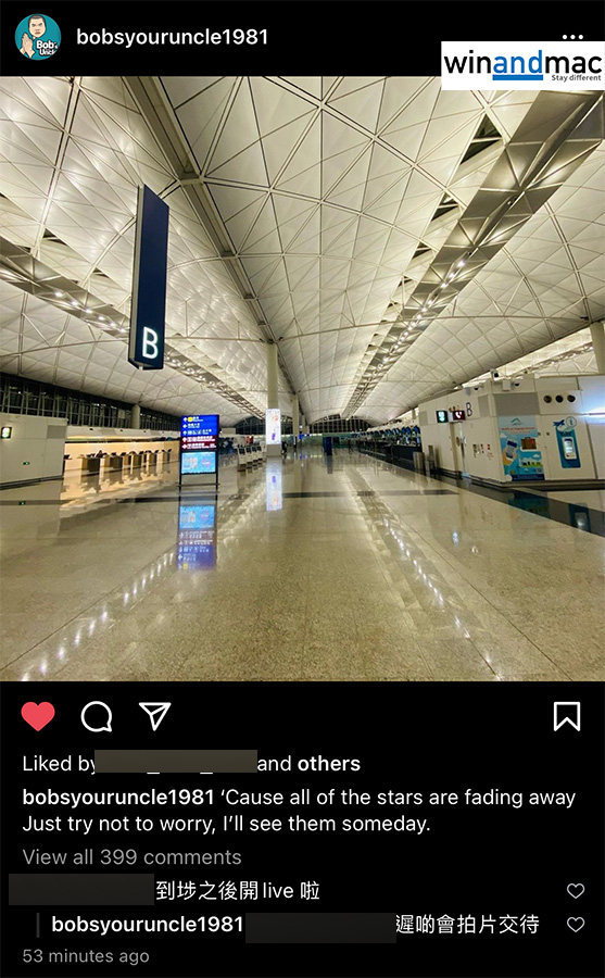 憑著出色的個人風格,風度翩翩嘅外型,Bob叔煮家男人吸引了超過50萬的訂閱用戶,每次做Live爆粗罵政府都幫大家出一口氣,當然教煮食的影片兼講時事個啲都好值得睇。除了自己頻道外,他都有和YouTuber合作,例如早前就私人拎錢出黎幫周庭添置新電腦。可是,有網民發現,Bob叔突然在Instagram放上一張機場相,寫道「’Cause all of the stars are fading away. Just try not to worry, I’ll see them someday」,似乎正準備離開香港。有人留言問及情況,以及希望他到埗之後開Live,Bob叔則回應指會遲啲拍片交待。