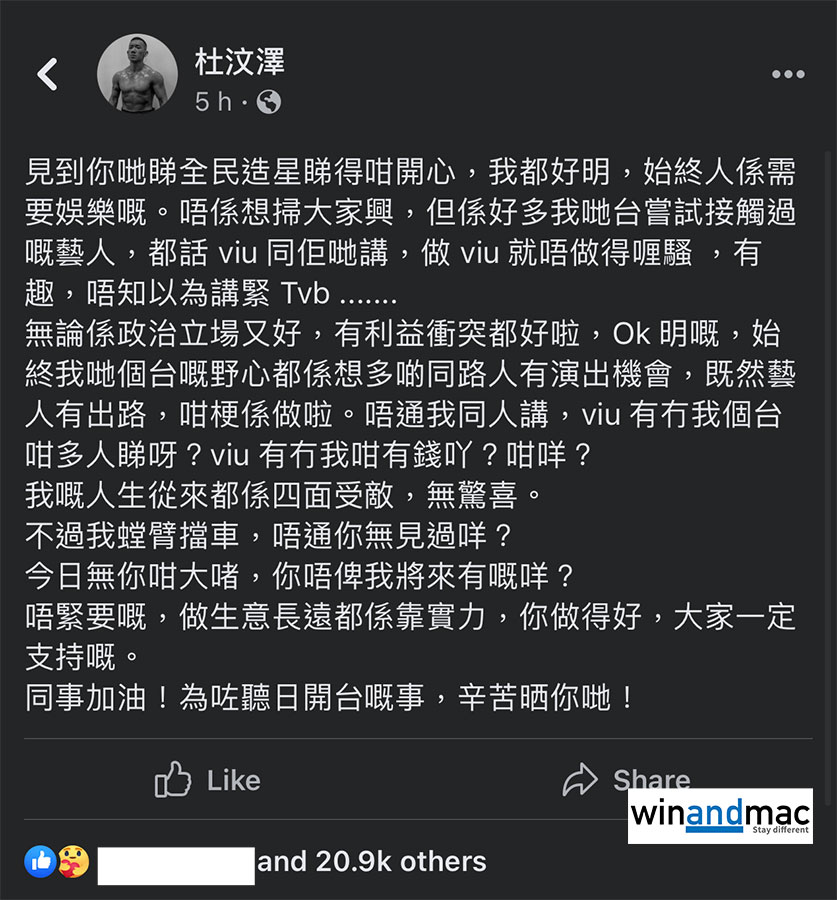 杜文澤稱無論是政治立場抑或利益衝突,都表示明白,並明白大家睇全民造星睇得好開心,不想掃興。他自家的平台理論上會於今天開台,對於這件事他認為「今日無你咁大啫,你唔俾我將來有嘅咩?」,並指「同事加油!為咗聽日開台嘅事,辛苦晒你哋!」。