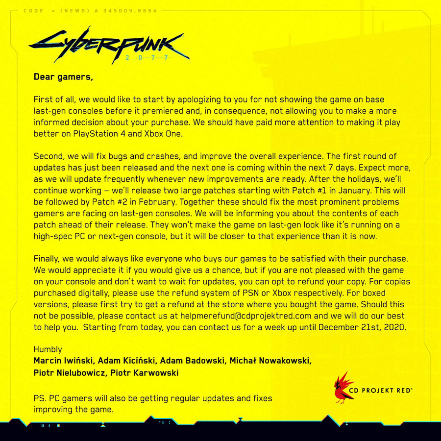 Cyberpunk 2077希望大家可以給予機會改善,但若果不想等更新的話,可以要求退款。若果是PSN或Xbox購買,內置已有相關系統可以要求退款,若果是實體盒裝版,可以去店舖問問能否退款,如果不可以的話,可以由即日起,於12月21日前都可以聯絡他們作出安排。