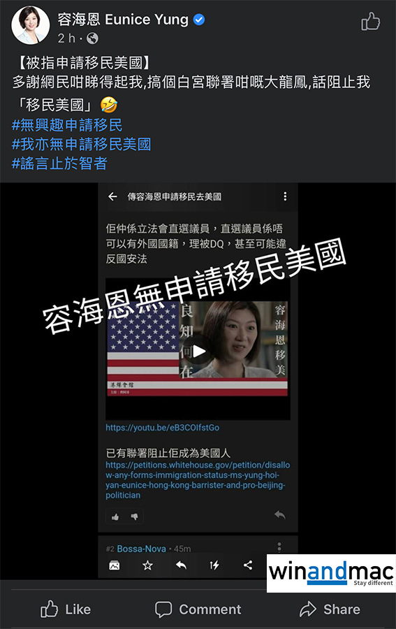 早前網絡突然之間有傳,容海恩將會隨美籍丈夫袁彌昌申請入籍美國。其後有不少香港的KOL或YouTuber吹風,再加上近來紫荊黨等事情,講到好像是真事一樣,又說容海恩因為土共的黨派被拆解,所以決定移民。有連登網民不滿,發起美國白宮聯署,要求阻止容海恩入籍。過了多個小時後,容海恩終於在社交網絡回應,指多謝網民咁睇得起佢,搞個白宮聯署咁嘅大龍鳳,話阻止她「移民美國」。她強調無興趣申請移民,她亦無申請移民美國,又說「謠言止於智者」。