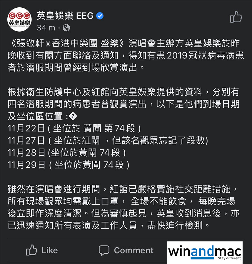 《張敬軒x香港中樂團 盛樂》早前在紅磡香港體育館舉行,原定是由11月22日至27日舉行,其後加場至29日。雖然幸運地逃過政府近日推出的新限聚令,但避不了武漢肺炎的威脅。英皇娛樂宣佈,以下4名潛服期間的病患者曾觀賞演出,大家或許要多加留意: