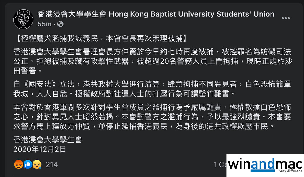 香港浸會大學學生會今早確認,浸大學生會的署理會長方仲賢於今早約7:00再度被捕,當時有超過20名警務人員上門拘捕,被控罪名為妨礙司法公正、拒絕被捕和藏有攻擊性武器,現時在沙田警署。浸大學生會發表聲明,「要求警方馬上釋放方仲賢,並停止濫捕香港義民,為身後的港共政權欺壓市民。」