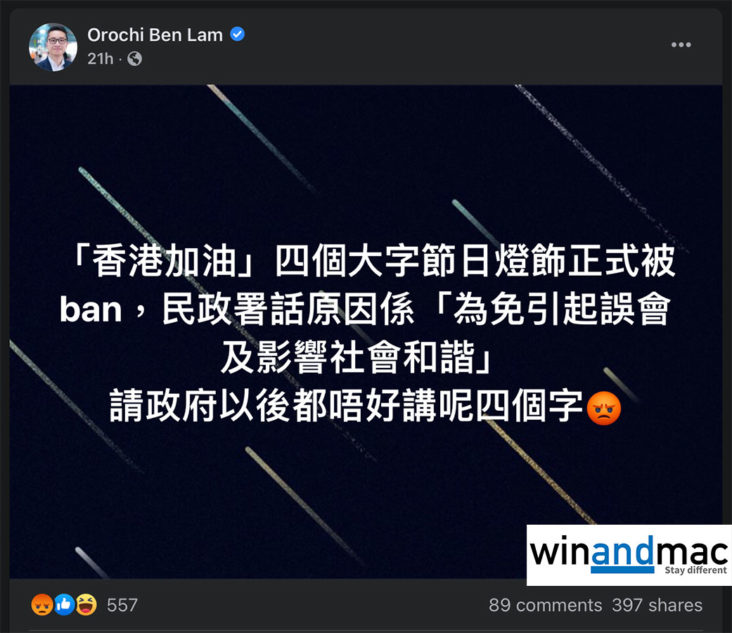 繼早前連登豬被民政署批評為「引起不安」後,油尖旺區議員林兆彬嘗試提出「香港加油」作為新年燈飾,獲節日慶典活動籌委會通過。可惜的是,他於日前收到民政署通知,指「香港加油」被拒絕是「為免引起誤會及影響社會和諧」。