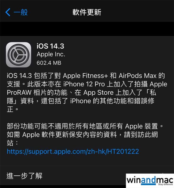 對於一般用家來說,今次iOS 14.3也修正了一些錯誤和問題,亦於App Store加入了私隱資料,兼開始加入Apple Fitness+新功能,唯目前只能在澳洲、加拿大、愛爾蘭、紐西蘭、英國和美國申請。另外,iOS 14.3正式版亦開始支援AirPods Max新產品。