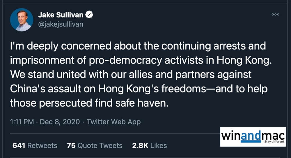 如今,拜登團隊的國家安全顧問Jake Sullivan終於就事件發聲。他指對於近日不停有支持民主的人士被捕或監禁表示密切關注,他們將會與盟友站在一起,對抗中國攻擊香港的自由,並會為受迫害的人尋找安全避難所。