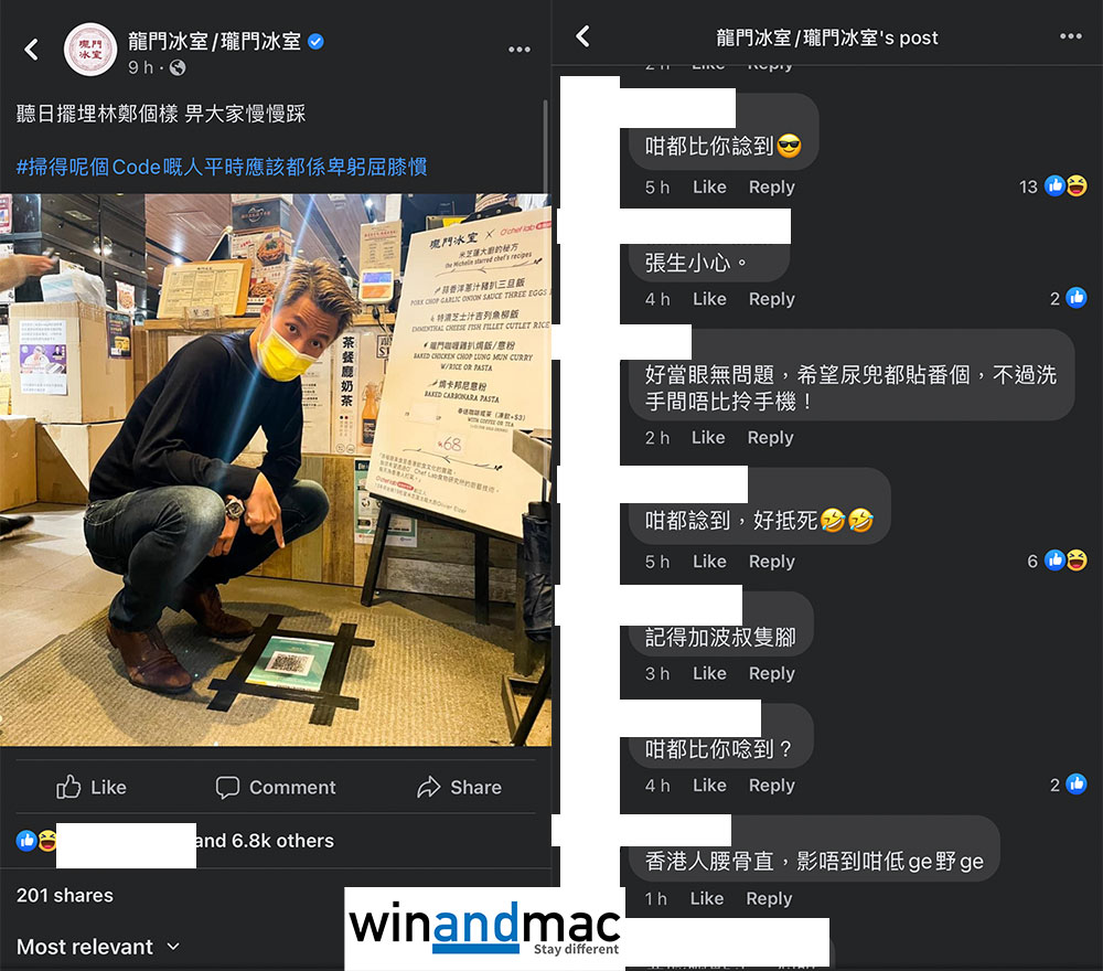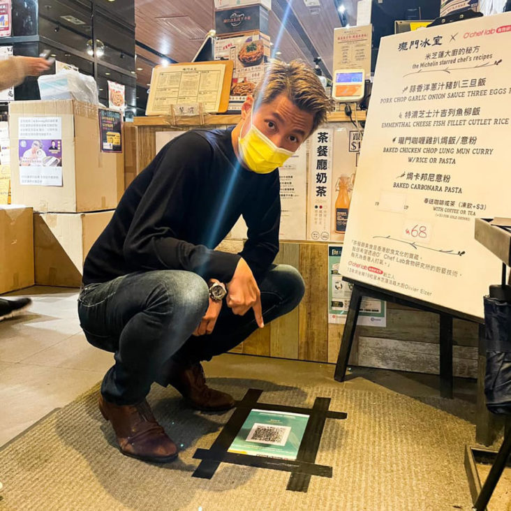 雖然尚未完全強制市民使用,但就要求各大食肆都一定要安裝,否則要罰款甚至坐監。龍門冰室與瓏門冰室都已經安裝了安心出行,不過老闆張俊傑似乎就想到一個好地方去貼這個安心出行QR Code。無錯,佢就係貼QR Code係地下。官方Facebook更寫道,「掃得呢個Code嘅人平時應該都係卑躬屈膝慣」,又說今天再放林鄭個樣,俾大家慢慢踩。