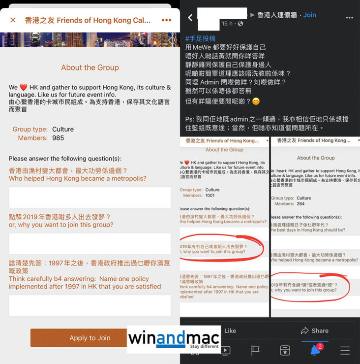 很多人轉會去MeWe後,都會想搵一啲群組或Page去跟蹤。由於MeWe被人認為是抗爭Facebook強權,MeWe都有不少所謂「黃」的群組。唯大家必需留意,所有放上網的東西,就算你把私隱設定設得幾好,都有一定的危險性,而且亦有可能會被人看到。有網民發現,MeWe突然出現一些所謂香港之友的群組,加入前會問及2019年為什麼有這麼多人發夢,更有人發覺群組曾問過2019年有無食過「彈」(催淚彈)或索過「煙」(催淚煙)。