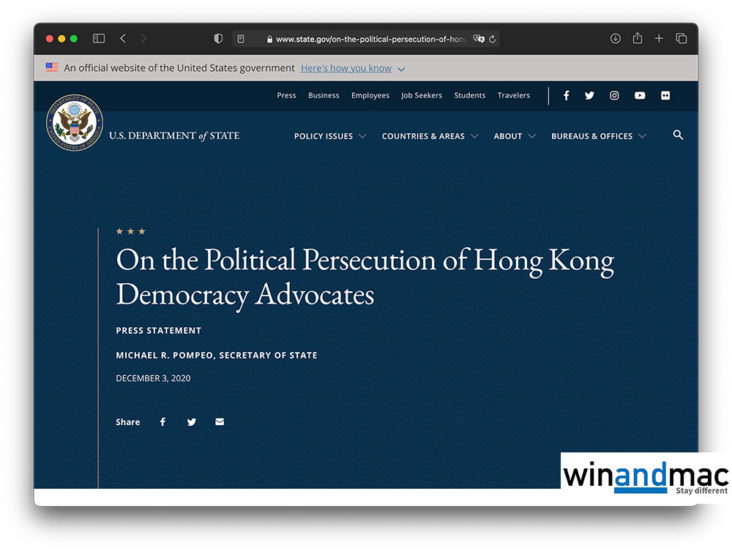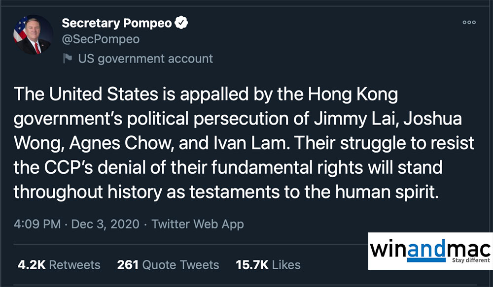 美國國務院及國務卿Mike Pompeo都有就日前黎智英被還押至下年四月發表聲明,指對此情況感到毛骨悚然。他們均形容為這是政治逼害,再次揭示中共政府最大的恐懼是人民的言論自由和思想自由。國務院聲明中提到,香港歷史上獲得不少好處,是因為自由和開放的制度,造就了和平民主派人士如黃之鋒、周庭、林朗彥及黎智英等。聲明最尾提到,美國會繼續與全球盟友合作,捍衛香港人權利和自由,包括所有在中共壓迫統治下受苦人士。美國會與黃之鋒、周庭、林朗彥及黎智英、香港人和所有中國人同在。