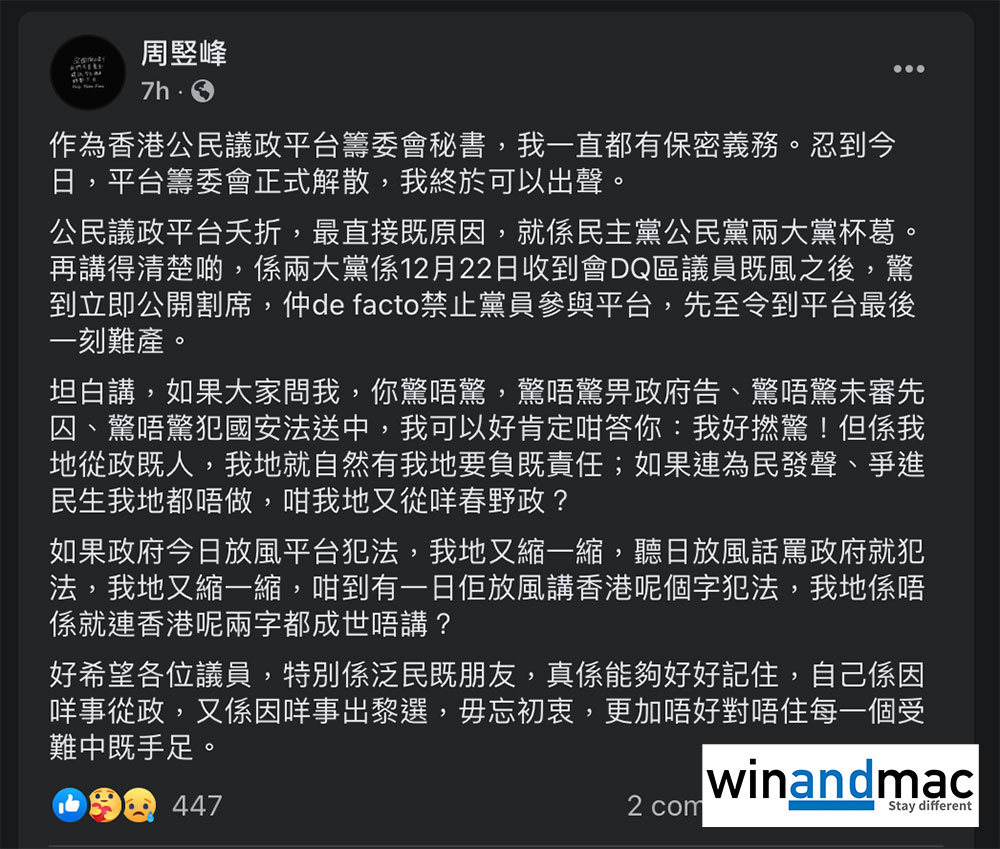 公民議政平台籌委會秘書周竪峰曾在社交網絡發表文章,寫明「公民議政平台夭折,最直接既原因,就係民主黨公民黨兩大黨杯葛。」。文章稱他也擔心會因為搞議政平台犯國安法送中,但結尾則稱「特別係泛民既朋友,真係能夠好好記住,自己係因咩事從政,又係因咩事出黎選,毋忘初衷,更加唔好對唔住每一個受難中既手足。」
