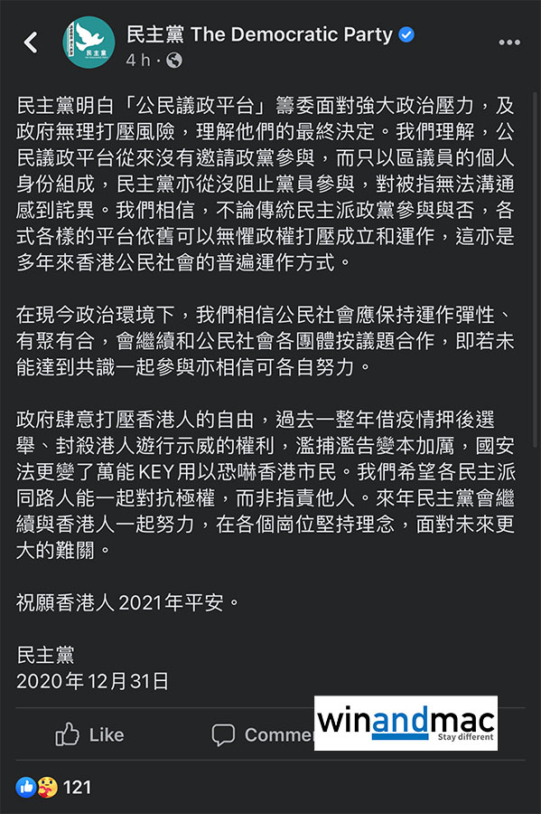 事件過後,公民黨主席梁家傑串爆稱記者會無答問環節,故此拒絕回應。民主黨則在除夕夜晚,則對有關不點名批評感到詫異,他們稱公民議政平台從來沒有邀請政黨參與,而只以區議員的個人身份組成,民主黨亦從沒阻止黨員參與。文中似乎暗指不一定要他們參與也可運作,寫道「傳統民主派政黨參與與否,各式各樣的平台依舊可以無懼政權打壓成立和運作」,又稱「即若未能達到共識一起參與亦相信可各自努力。」。民主黨亦似乎不滿有人不點名批評,稱「我們希望各民主派同路人能一起對抗極權,而非指責他人。」。