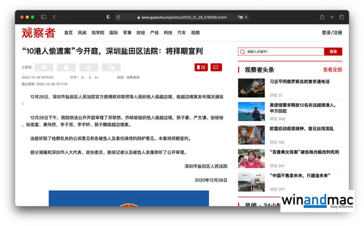 12港人涉嫌偷渡案的其中10人案件,日前於深圳鹽田法院審理。根據大陸傳媒報道,以及深圳鹽田法院網站刊登的通知,已依法公開開庭審理鄧棨然、喬映瑜組織他人偷越邊境,以及其他8人偷越邊境案。他們亦強調,部分港籍和深圳市人大、政協、記者和被告人親屬有在場參與旁聽。他們聽取檢察機關的公訴意見和各被告人和委託律師的辯護意見,將擇期宣判。