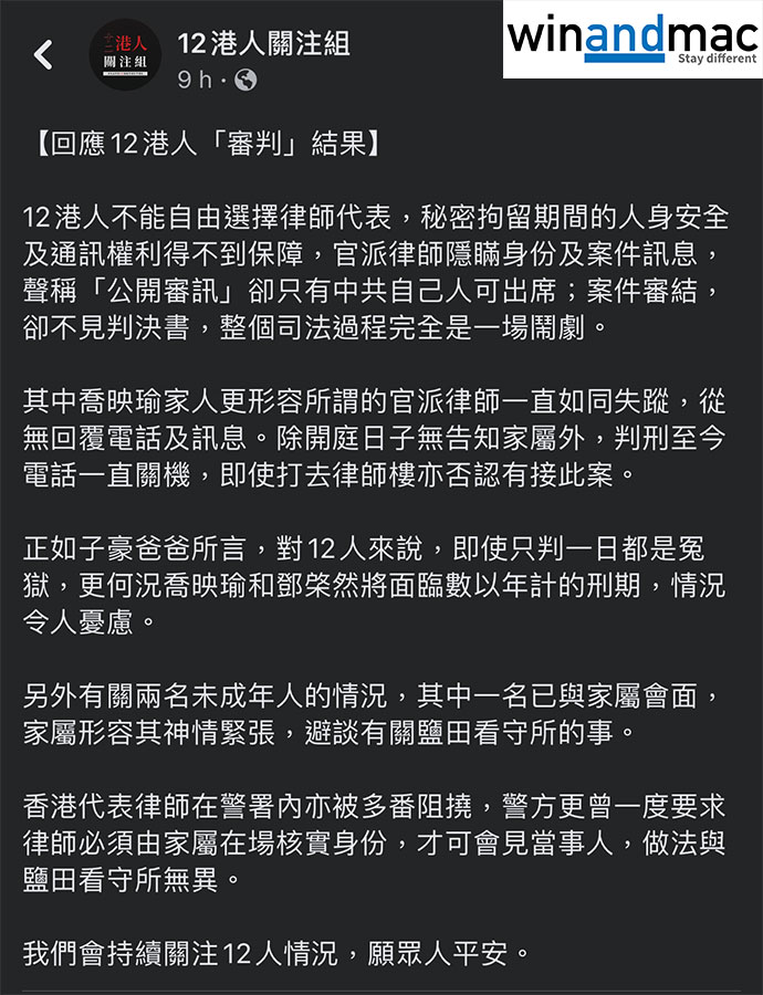 12港人關注組表示會繼續關注,批評整個司法過程完全是一場鬧劇,當中聲稱「公開審訊」卻只有中共自己人可出席,如今案件審結,卻不見判決書。