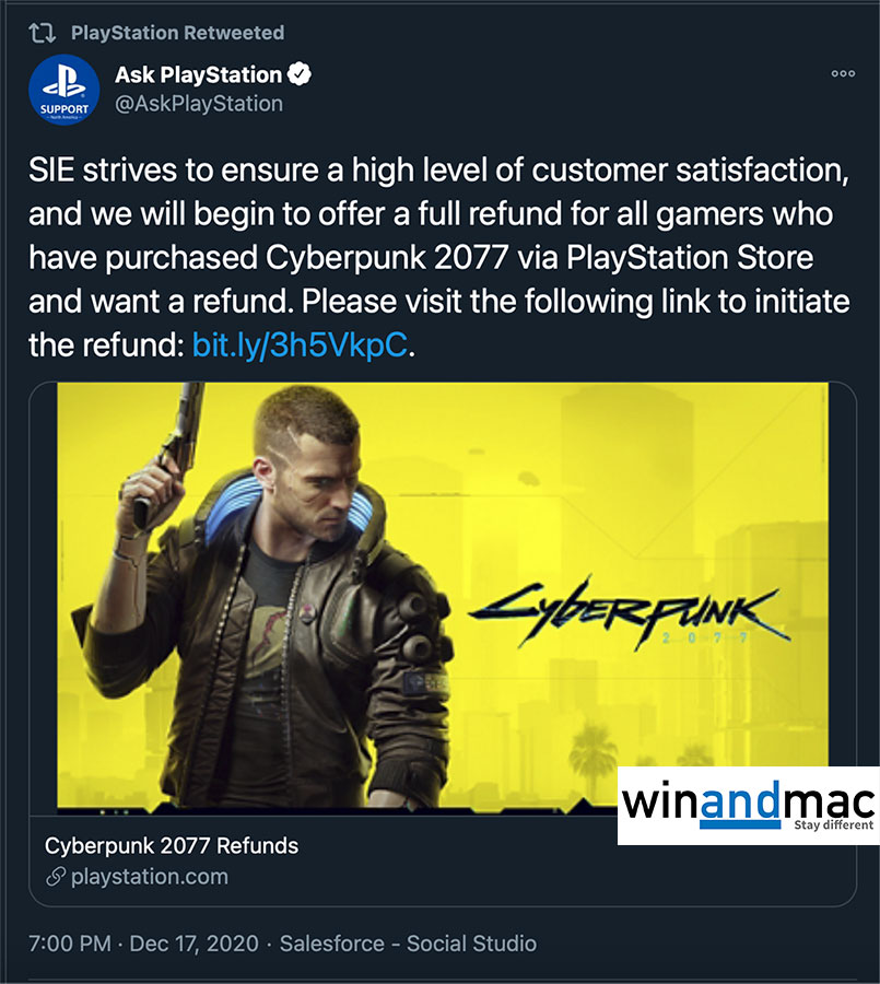 Sony PlayStation於日前宣佈,為了讓用家有最好的體驗,將會允許透過PlayStation購買的用家以全數方式退款,香港用戶也可按此要求退款。另外,Cyberpunk 2077由即日起亦會從Sony PlayStation Store下架,直至另行通知為止。