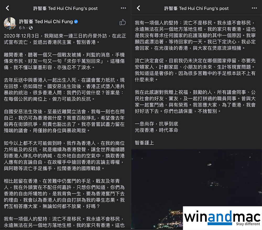 數小時前,許智峯終於有最新消息,確定暫別香港,並會退出民主黨,簡單一點來說,即是正式流亡。他指離開香港一下,強忍不了淚水。許智峯稱目前能力所及的,就是拉闊國際戰線。他指自己寧願四處漂泊著,不會尋求任何國家的庇護落腳,流亡不是移民。他永遠不會移民,永遠無法在另一個地方落地生根,他的家只有香港,並已下定決心,必定會回家,在光復後的香港,與大家在煲底流淚相擁。