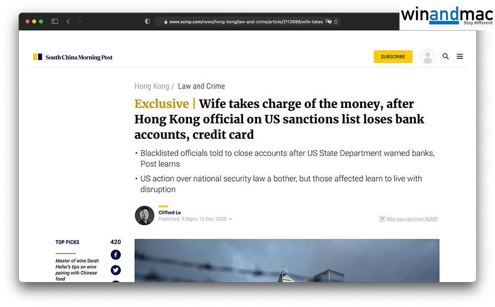 該匿名官員向南早稱,日常出外購物或食飯等,需改以現金或八達通,除非靠老婆才可以使用信用卡或其他付款方式。該名高層的香港官員更指,日常開支唯有靠老婆繳付,包括電話帳單、家庭水電費等開支都要靠老婆。唯有關官員未有因此感到內疚,反而大罵制裁造成他不便,並認為自己做的事情很正確。該官員指這種做法離譜,他們只是在香港執行法律對付犯法的人,卻受外國制裁。(It is ridiculous. We implement the law in Hong Kong to punish lawbreakers, but we are being sanctioned by another country.)。