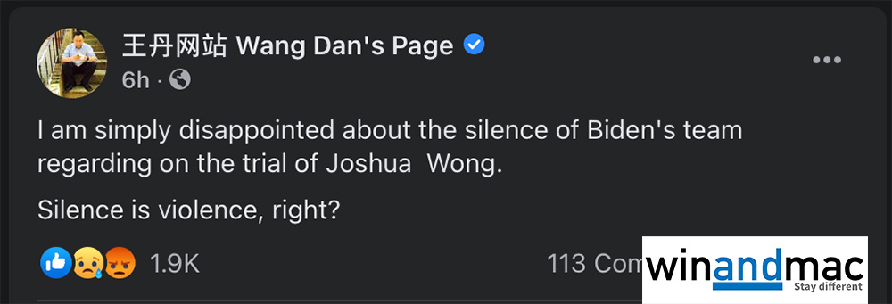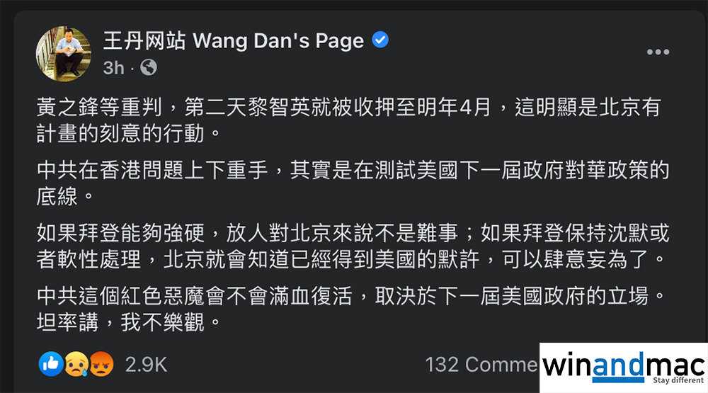 昨天黃之鋒、周庭與林朗彥三人被重判即時入獄,今天則有黎智英也正式被還押,要等到四月再審。世界各國都有政要就此發聲,關注有關事件,唯美國總統候選人拜登則零反應。民運人士王丹以英文發表文章,稱對於拜登團隊零反應十分失望,質問沈默是否也算是暴力。他其後再次提到今天事件,認為先重判黃之鋒,再還押黎智英,「明顯是北京有計畫的刻意的行動。」。