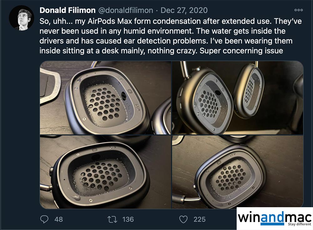 不過,最近有AirPods Max用家發覺令人困擾的問題,就是耳罩內竟然出現大量小水珠。有用戶在Twitter發表有關文章後,很多用戶都表示遇到類似問題,估計可能與AirPods Max所採用的質料有關。有關用戶表明沒有在潮濕天氣下使用,外界猜測有可能是因為AirPods Max使用金屬物料,可能會較冷。但耳罩內的空氣較暖,暖空氣遇到冰冷的金屬物料,就會形成小水珠。這與用家身處天氣較冷的地方亦有可能有關。