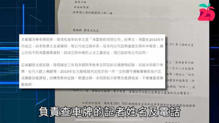 唯香港警方又不滿意,於日前向蘋果日報發出信件,稱正在調查一宗有關《道路交通條例》案件,要求蘋果日報總編輯向警方提供撰寫涉事報道的記者,以及資料搜集員的姓名和聯絡資料,以協助調查。《蘋果》總編輯羅偉光表明當時表格上所寫的目的,和最終使用用途一致,表明不會向警方交出資料,斥警方行動純粹為威嚇記者。