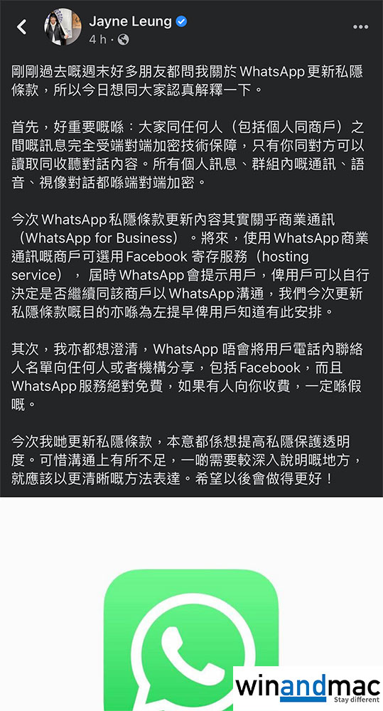 她率先提到,大家與任何人包括個人和商戶,雙方的訊息會有點對點加密技術保護,只有自己與對方可以讀取和收聽對話內容。另外,今次更新私隱條款,是與商業通訊有關,這是為了讓WhatsApp商業商戶可以使用Facebook的寄存服務。她強調,WhatsApp 不會將用戶電話內聯絡人名單向任何人或者機構分享,包括Facebook在內。她稱,今次彈出通知原意都是想提高私隱保護透明度,但也承認溝通上有所不足,希望未來做得更好。