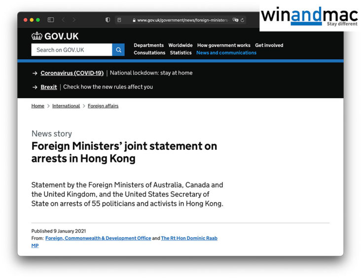 英國外相藍韜文Dominic Raab、美國國務卿蓬佩奧Michael Pompeo、澳洲外長佩恩Marise Payne和加拿大外長商鵬飛Francois-Philippe Champagne聯合就早前香港政府拘捕35+初選參加人士而被指違反國安法發表聲明,斥國安法違反中英聯合聲明,以及破壞一國兩制。他們斥國安法用來排斥異見人士,以及打壓不同的政見,削弱香港人的自由和權利。