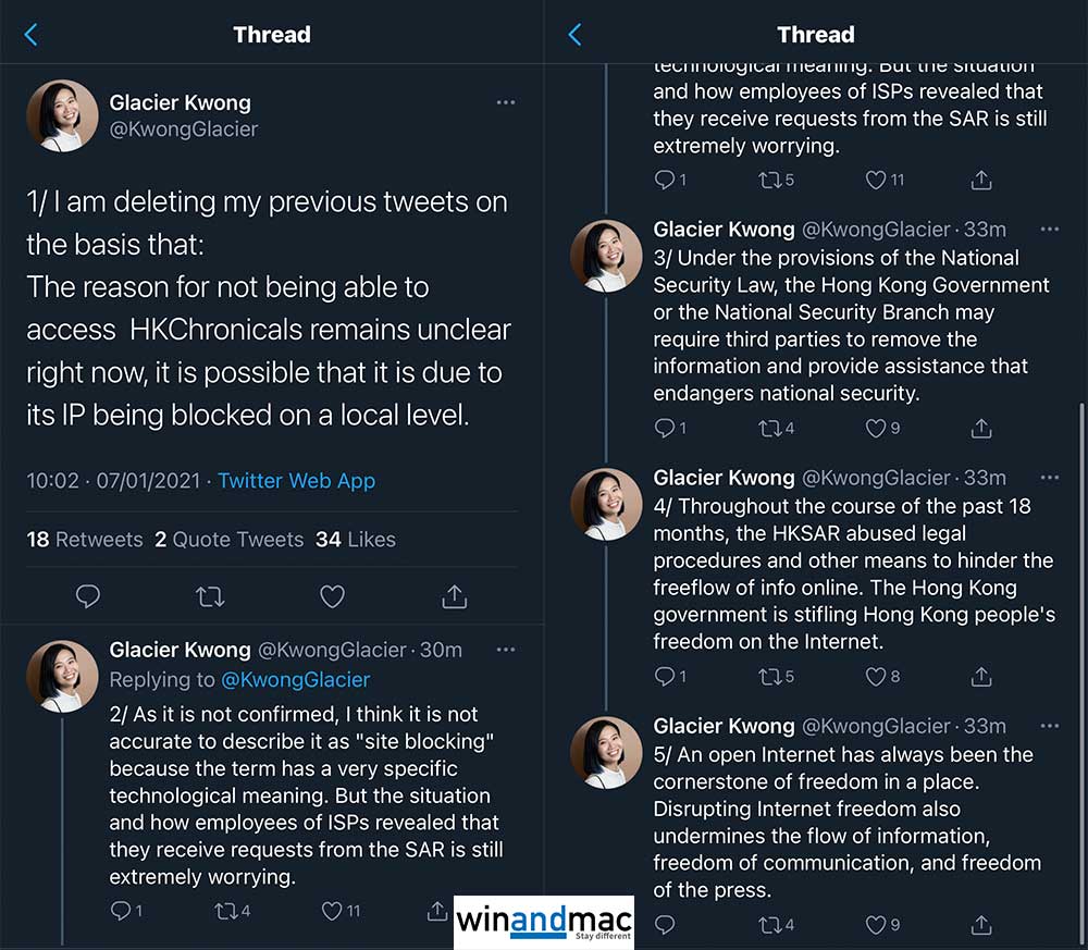 陳妍茵續指,就現時的跡象及證據,有理由相信香港的網絡供應商主動封鎖本站內容,而當中或涉及政府部門的要求或合作。流亡德國的鍵盤戰線前發言人鄺頌晴則在Twitter發表文章,經實驗後發現只能透過VPN才能在香港境內瀏覽香港編年史https://hkchronicles.com/。 同時,她亦收到在CSL和Smartone工作的員工透露,政府正要求香港ISP封鎖特定網站Cite blocking。鄺頌晴提到國安法下,香港政府或國安處可要第三方移除危害國家安全的信息。鄺頌晴其後刪除有關文章,但只是因為目前網站無法瀏覽原因未明,她仍堅持指有ISP員工收到特區政府要求。