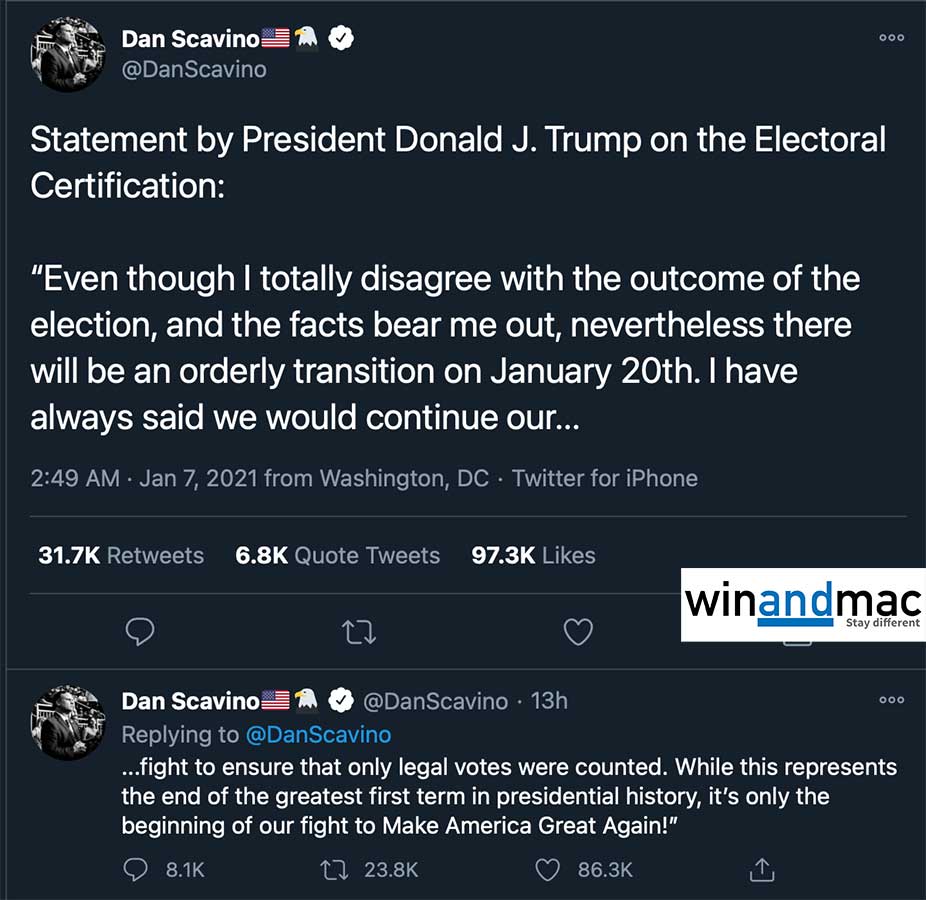 國會山莊經過一輪的混亂後,國會終於能夠正式恢復程序,確認拜登當選下一屆美國總統,以及賀錦麗為下一屆美國副總統。由於目前多個社交網絡都禁止特朗普使用或發表文章,結果要由其社交媒體負責人Dan Scavino協助發表聲明。聲明指特朗普完全不同意選舉結果,事實亦令他本人震驚,但他仍然會在1月20日有序過渡權力。特朗普仍然強調,將會繼續戰鬥,確保只有合法選票會被計算。