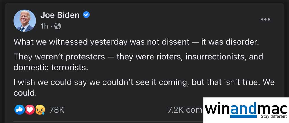 拜登在美國時間1月7日,仍然不停評擊攻入國會山莊的人,並指他們是暴徒。整個衝入國會山莊事件中,有4名示威者死亡。