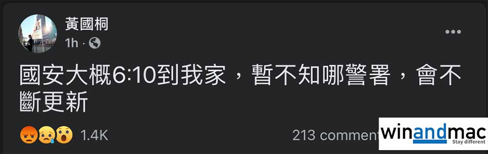 曾協助不少反送中被捕人士的律師黃國桐,本身也是九龍城區太子區議員。黃國桐早前亦協助流亡台灣的手足,發起保護傘計劃,讓他們能夠在台灣工作自力更新。其專頁今早稱,國安有人大概於6:10去到他家中,暫不知去那一間警署。