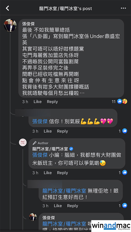 傳真社稱嘗試聯絡張俊傑但沒有回應,不過張俊傑自己於晚上在龍門冰室/瓏門冰室回應有關指控,稱傳真社「如獲至寶」搵到的公司,亦即被指與富臨關連人士持有的公司「鼎盛宏英餐飲有限公司」,其實只係單單擁有屯門海麗花園的舊有加盟店。他續指有關加盟店於2019年11月已經無再營業,並質問記者「咁我到今時今刻仲點同富臨,有啲乜嘢生意來往呢?」。