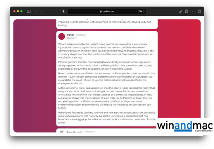 早前我們提過Parler將向Amazon提出訴訟,認為Amazon與其他大科公司夾埋,一起杯葛Parler想殺死他們公司。於當地時間星期四,法院初步裁定Parler敗訴。法院稱,Parler提供的證據薄弱,無法證實Amazon違反反壟斷法,也無法證實Amazon與Twitter一起合作專登整死Parler。