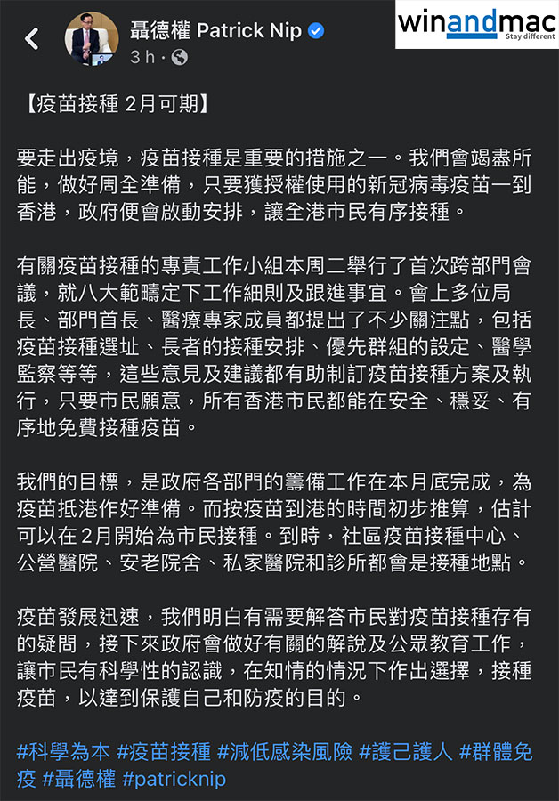林鄭宣佈購買疫苗後,預計今年年初就有機會開始接種。公務員事務局局長聶德權日前在社交網絡發表文章,稱估計2月起就可開始接種。他提到早前開會,就八大範疇定下工作細則及跟進事宜,包括疫苗接種選址、長者的接種安排、優先群組的設定、醫學監察等。他們已設定目標,希望在1月底前,政府各部門完成相關籌備工作。