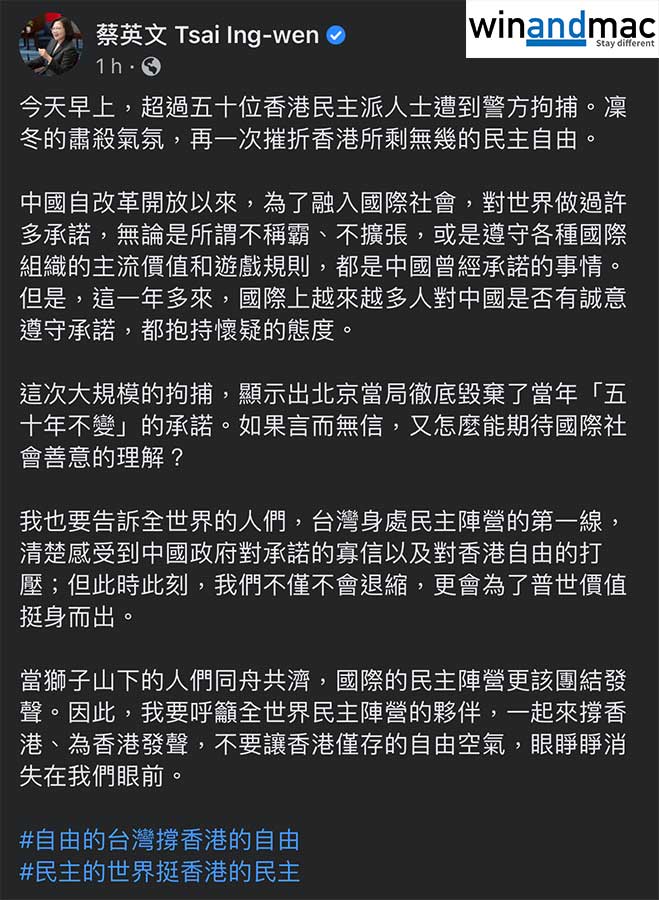 日前本來美國總統大選有新形勢發生,但是「多得」中國香港政府大搜捕泛民主派人士,引發全球關注。日前台灣總統蔡英文也有就此事發言,再次談及「自由的台灣撐香港的自由,民主的世界挺香港的民主」。她提到,今次拘捕超過50位民主派人士,再一次摧折香港所剩無幾的民主自由。