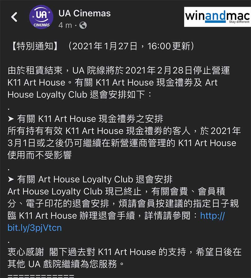 限聚令持續,大家目前仍然無法如常出外與朋友娛樂,不少餐廳電影院等都大受影響。UA院線剛宣佈,在K11 Art House的影院因為租賃結束,將於2021年1月28日(即明天)結業。之前加入了相關Art House Loyalty Club,可以選擇退會,詳情請參考官方網站。至於購買了K11 Art House現金禮券,於2021年3月1日或之後仍可繼續在新營運商管理的K11 Art House使用而不受影響。