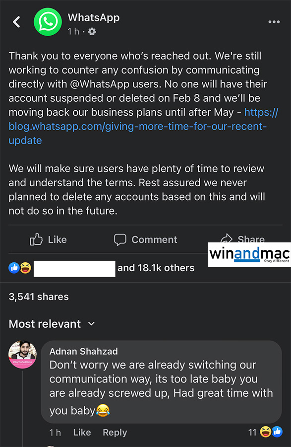 可能見太多人轉會WhatsApp終於開始驚,今日宣佈有關政策將會推遲至5月15日。不過,他們在文章中仍然死口不認自己有問題,指大家都是收到假新聞資訊,尤如香港藍絲一樣。網民在官方留言中強調,不用擔心,他們會繼續轉會。