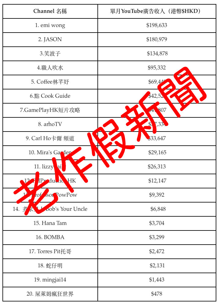 早前某網媒報道指,稱香港YouTuber收入Top 20排行榜大公開,其實當中寫到「理論上upload嘅影片越多,Youtuber嘅收入就越高」本身已經大錯特錯,早前已經有YouTuber提到因為上載一些新影片太少人睇,而被拉低收入。YouTuber Jason大J也榜上有名,而且排第二位,單月YouTube廣告收入超過HK$18萬,第一名的emi wong更逼近HK$20萬。