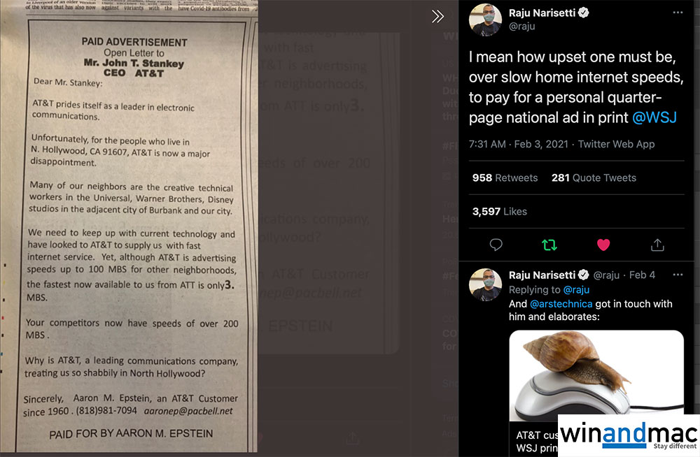 由於遲遲未有光纖寬頻提供,他嬲爆決定用US$10,000在華盛頓郵報登廣告(下圖),刊出公開信俾AT&T CEO John Stankey,質問AT&T既然稱自己是通訊業的領導,但卻要令住在他區域的人失望。他提到,AT&T常賣廣告指他附近有光纖寬頻100Mbps,但他家中上網僅得3Mbps,並指競爭對手都做到200Mbps。事件曝光後,他接受一些傳媒訪問時,提到有時都無3Mbps,慢到喊咁話。