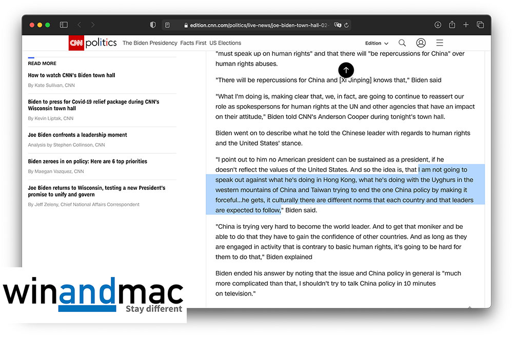 他指自己與習近平通話時,提到美國總統必需維持美國的價值。不過,他講明自己不會為香港、維吾爾族或台灣等事情發聲,又或透過中止一個中國原則去逼習近平。文化上,各個國家的領導人都被預期要跟著一些規範去做。拜登續指,若果中國仍然做一些違反基本人權的事情,難以在國際上成為真正的大國。拜登其後極速想完結話題,指中國問題複雜,不能在電視上用十分鐘講出有關政策。