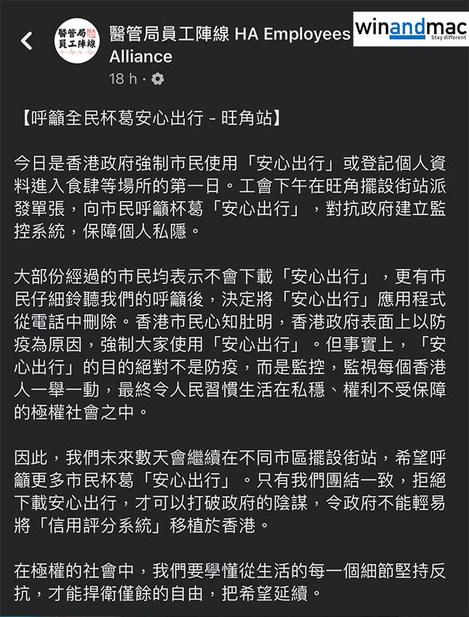 醫管局員工陣線發起運動,在街站呼籲全民杯葛安心出行。創新及科技局(創科局)和醫管局均因此發表聲明,以不點名方式指責有人打著醫護旗號,發佈安心出行失實資訊。創科局再一次指,安心出行app用戶不用登記,app本身無追蹤功能,亦不會備存用戶資料到任何政府或其他系統。出行紀錄只存放用戶手機,出行紀錄的比對和提示功能亦只會在手機程式內進行,個人行蹤不會外洩,絕不構成私隱風險。