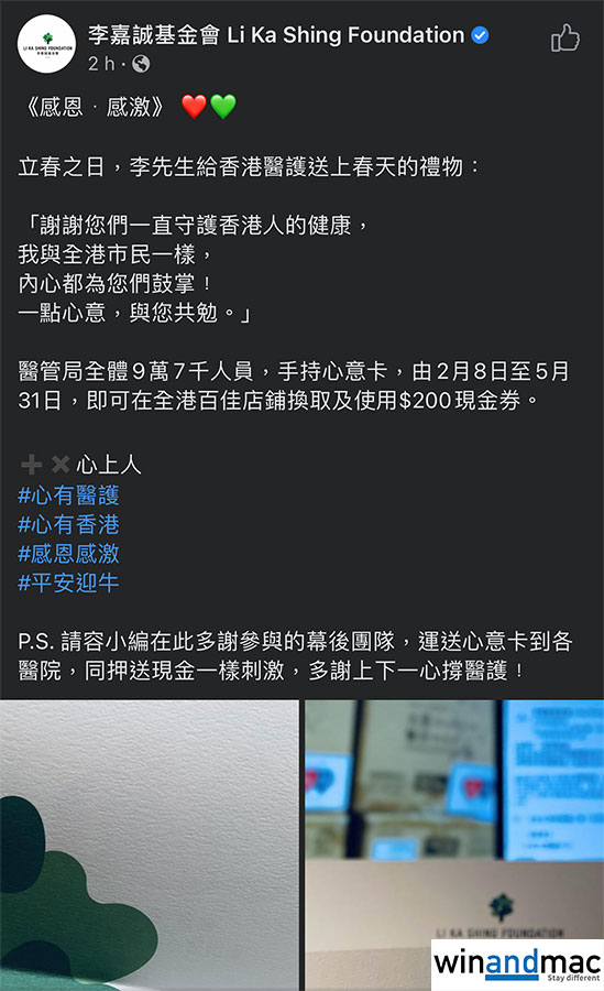 醫管局在疫情期間,如何對待香港醫護工作人員,大家隨意找找就可以知道。已經不止一次多謝香港醫護為疫情而努力的李嘉誠,其基金會今日再宣佈於立春之日送上心意卡。醫管局全體9萬7千人員,只要手持心意卡,由2月8日至5月31日即可在全港百佳店鋪,用心意卡換取和使用$200現金券。基金會社交網絡提到親身把心意卡送到各醫院,並提到「多謝上下一心撐醫護」。