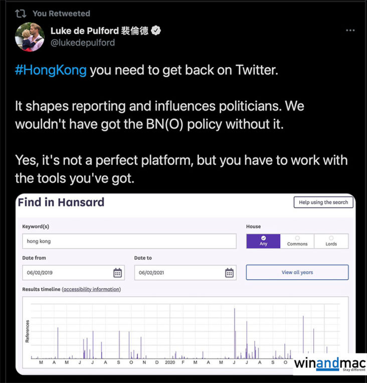 自從美國大選前後,大家看清楚各大科技公司包括Facebook、Google與Twitter如何控制言論,有很多人都嬲爆不再用這些科技公司提供的服務。不過,一直有幫香港人發聲的英國保守黨Luke de Pulford,他最近在Twitter發表文章,加上一張數據圖片直言叫香港人要返回Twitter社交平台。